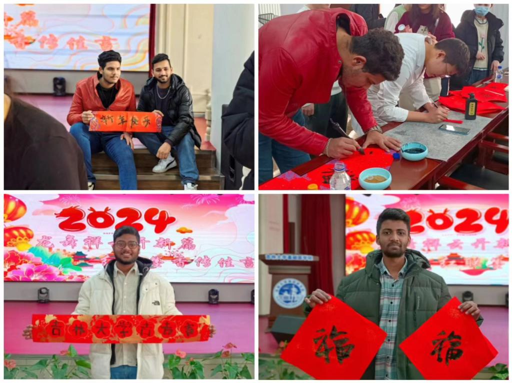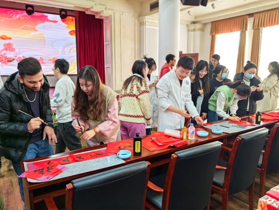 MBBS international students of our college also actively participated, eagerly joining in the ranks of writing spring couplets. Stroke by stroke, horizontal and vertical lines—they personally felt the infinite charm of traditional Chinese culture and the strong festive atmosphere. Everyone took group photos as souvenirs, sharing the joyful festive vibe together.