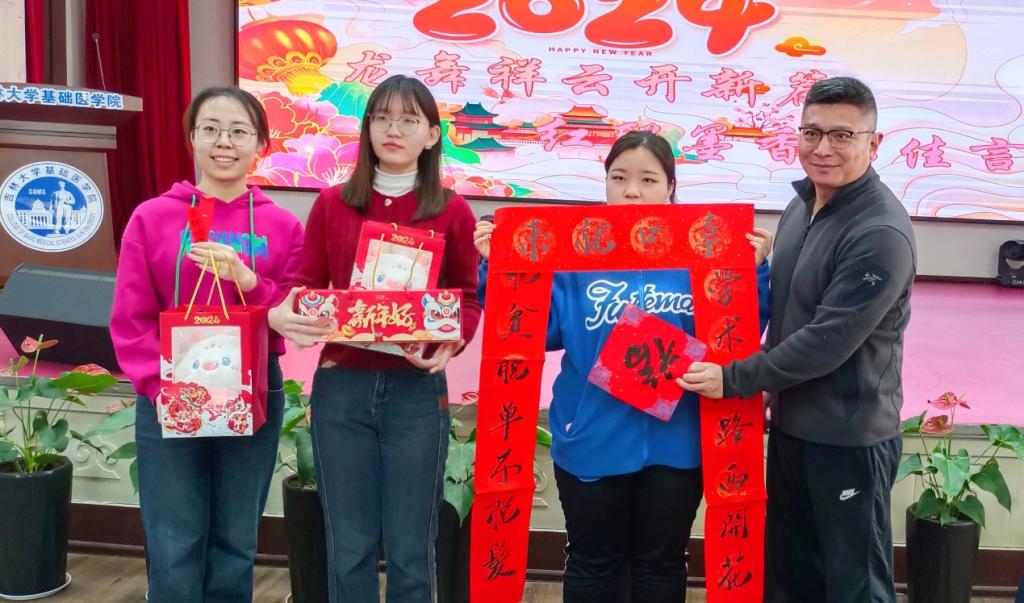 The dragon dances with auspicious clouds to start a new chapter, and red couplets with ink fragrance convey kind words. As the Spring Festival approaches, the festive atmosphere grows stronger. Greeting the Spring Festival and pasting spring couplets are an indispensable part of welcoming the New Year—each pair of spring couplets embodies people’s beautiful aspirations for the coming year. To care for postgraduate students staying on campus and MBBS international students, and create a joyful, peaceful, and festive Spring Festival atmosphere, the College of Basic Medical Sciences held the “Brushes Dance in Flying Style, Red Couplets Celebrate the Spring” activity of writing spring couplets and sending blessings in the lecture hall on the second floor on January 25. Teachers and students gathered together, picked up brushes, and wrote sincere Spring Festival blessings.